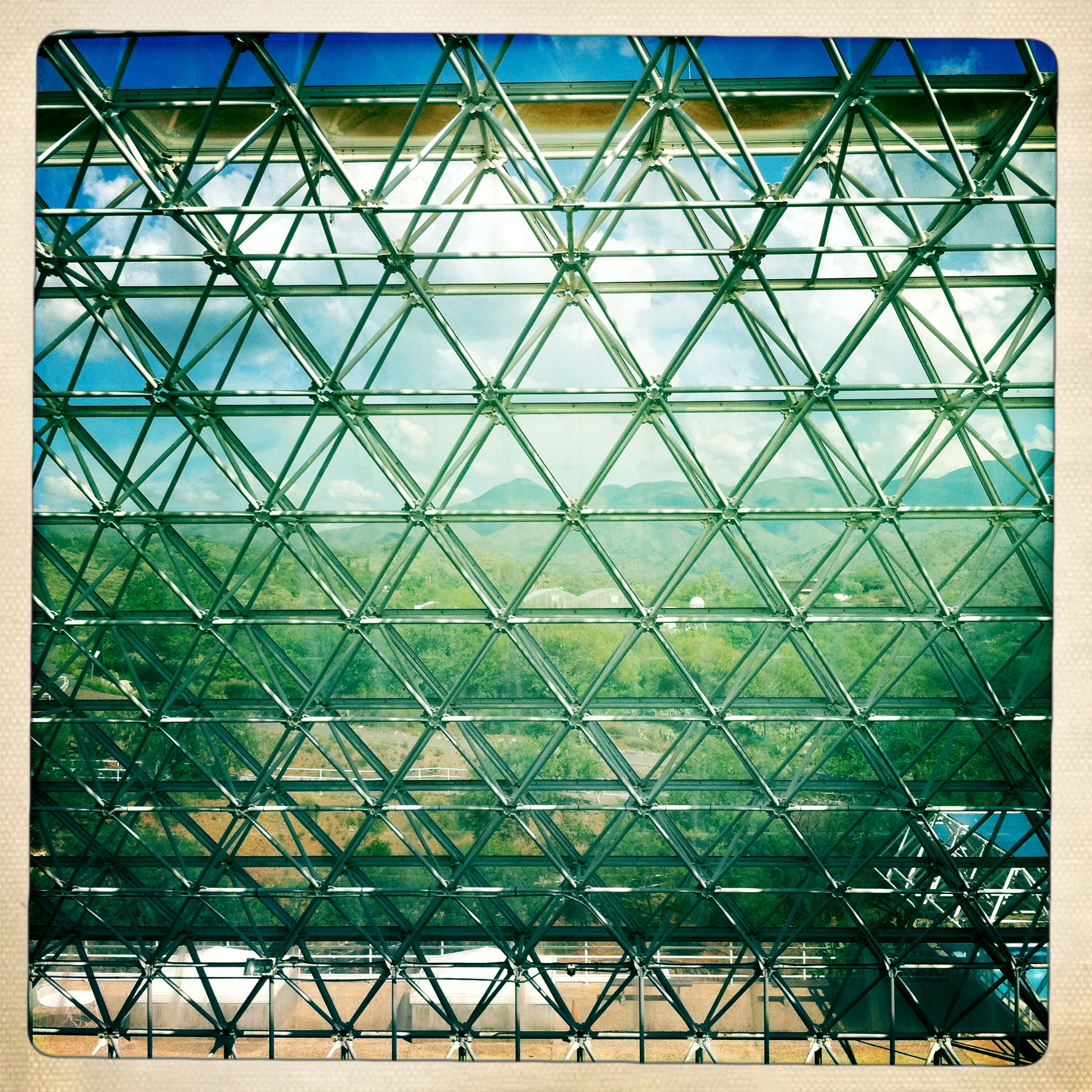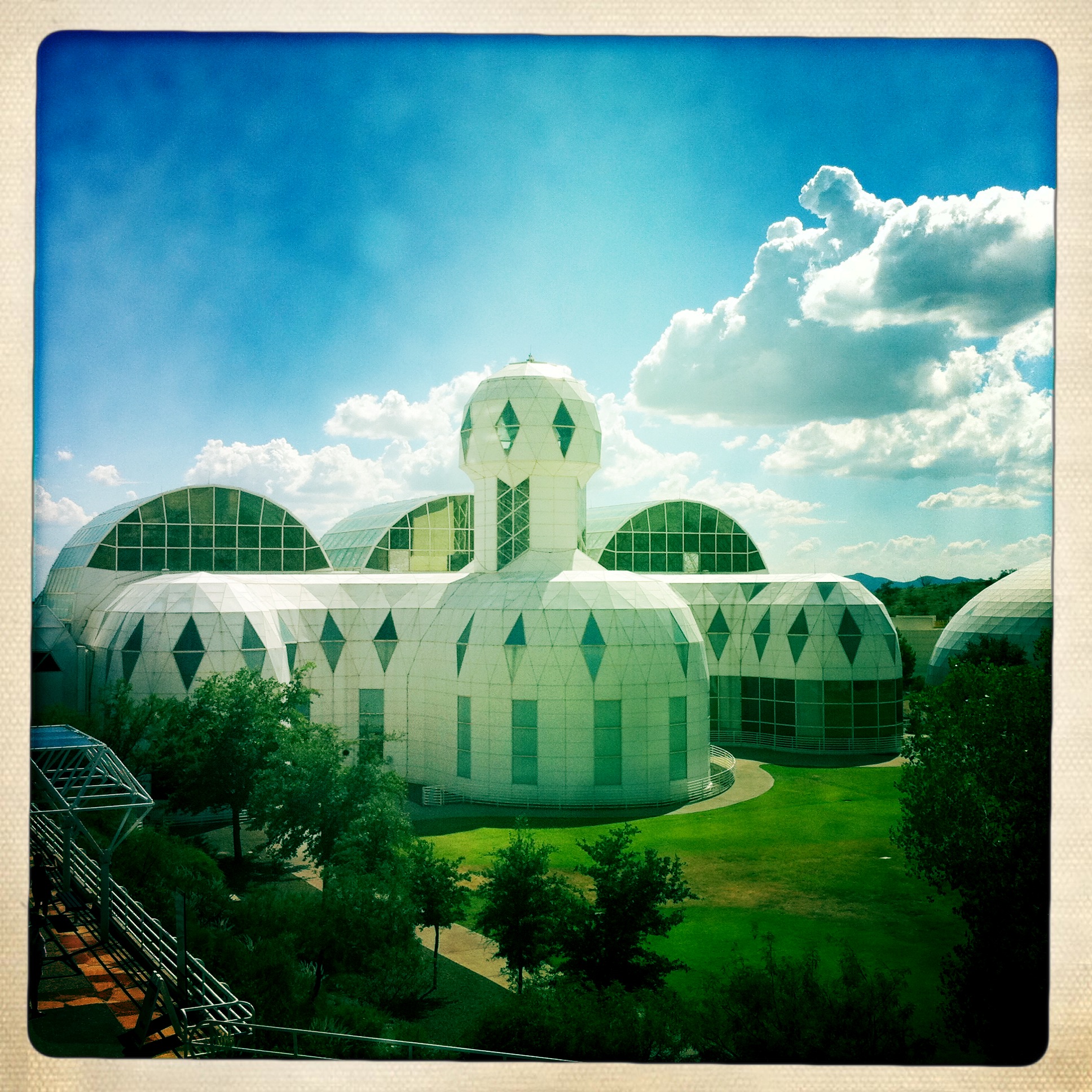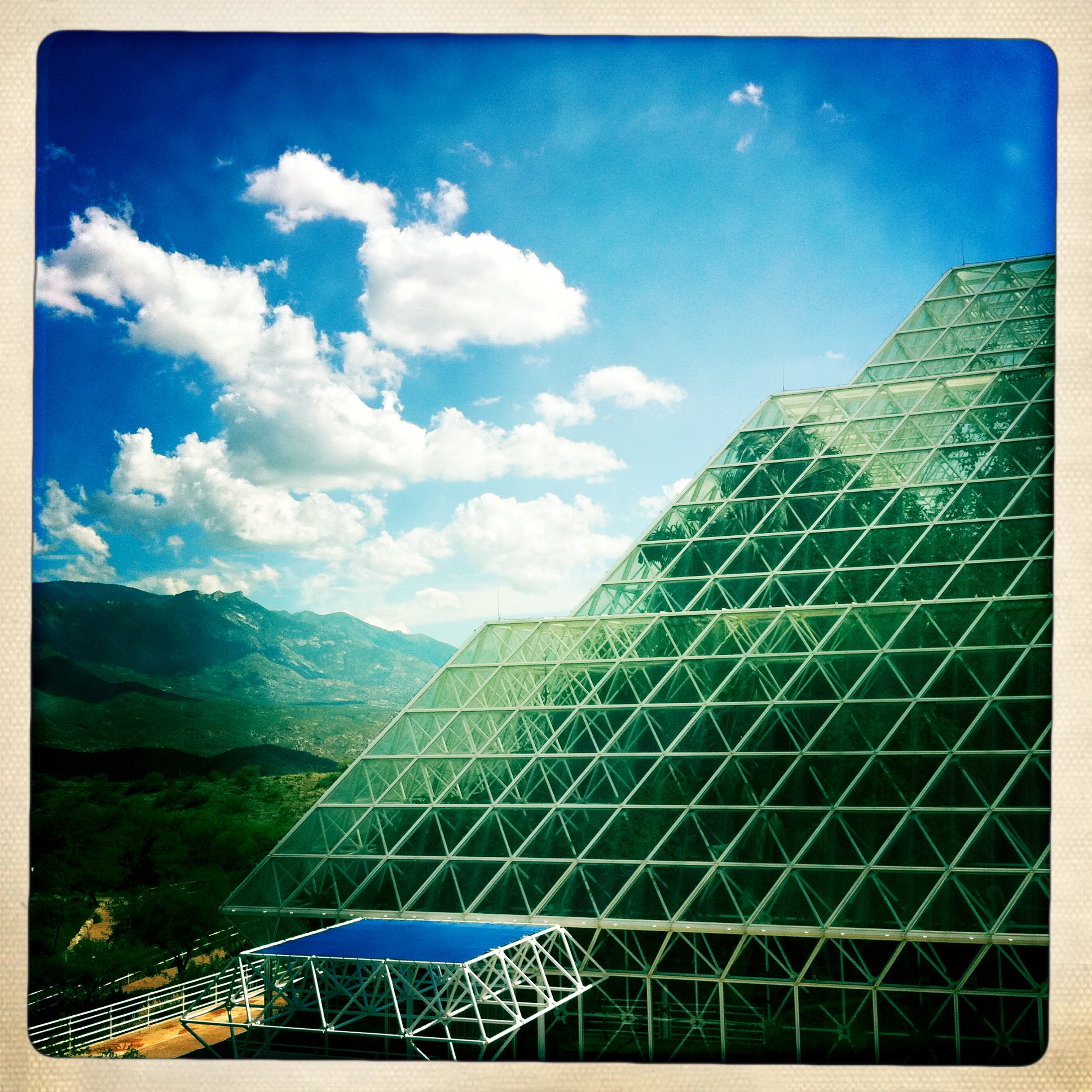 “Biosphere 2 is a 3.15-acre (12,700 m2) structure originally built to be an artificial, materially-closed ecological system in Oracle, Arizona (USA) by Space Biosphere Ventures. Constructed between 1987 and 1991, it was used to explore the complex web of interactions within life systems in a structure that included five areas based on natural biomes and an agricultural area and human living/working space to study the interactions between humans, farming and technology with the rest of nature.”