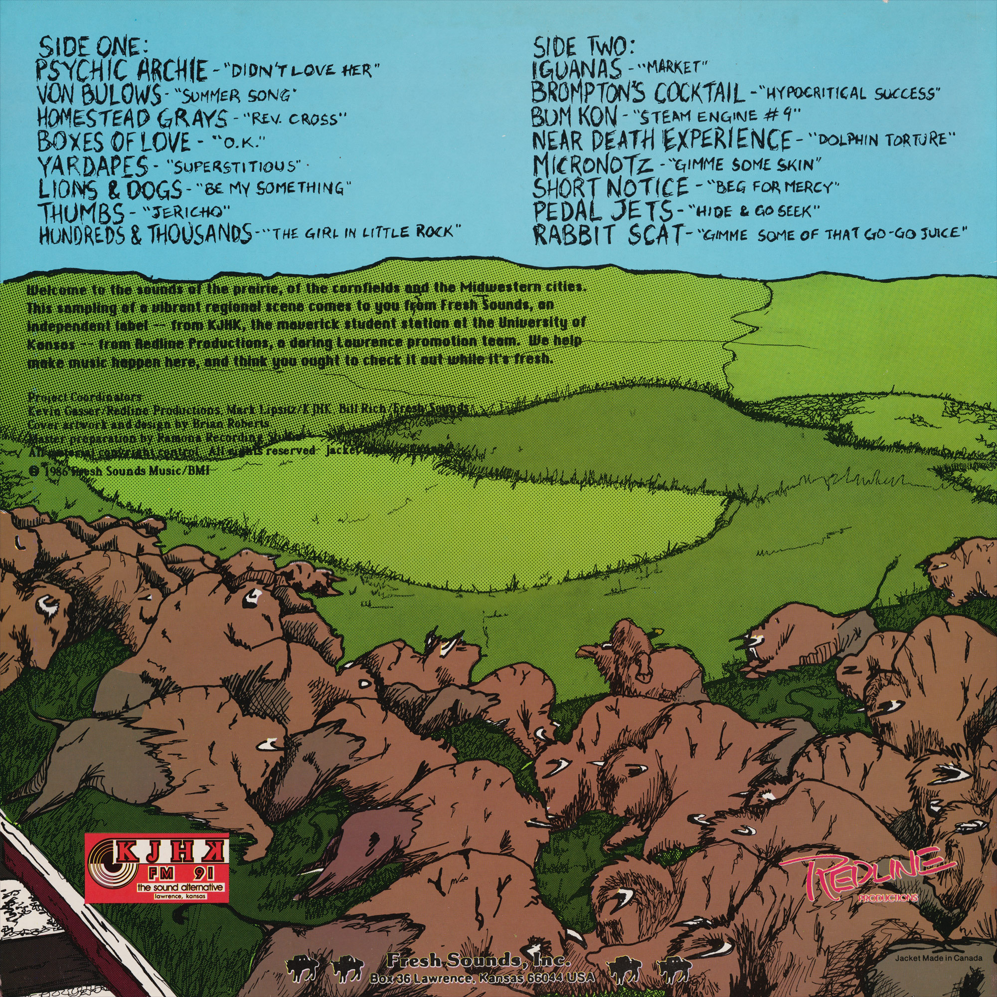 - Redline and KJHK Present: Fresh Sounds From Middle America #3 – Back Cover Art by Brian Roberts, Lettering by Jason Willis (Fresh Sounds, 1986, Compilation LP)