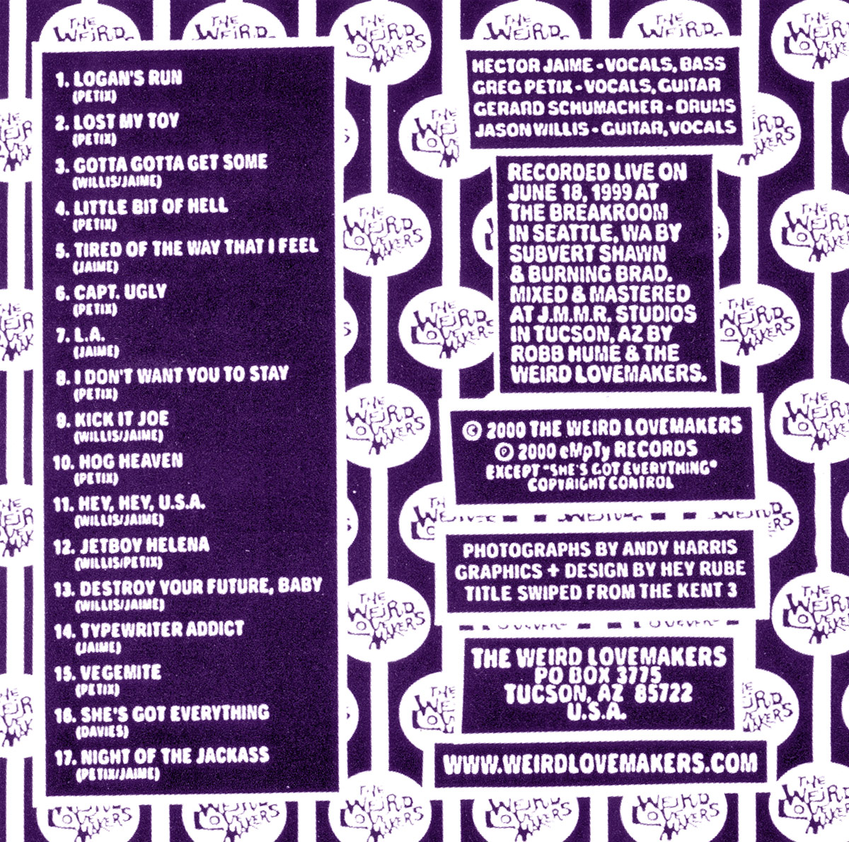 - Weird Lovemakers – Live: Bigger than a Cookie, Better than a Cake – CD Booklet Back Cover (eMpTy Records, 2000)